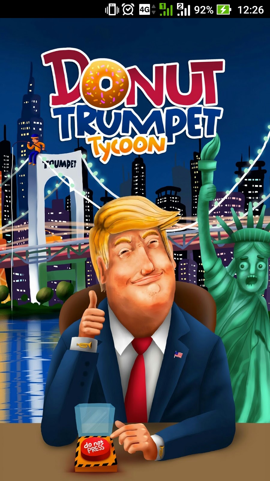 The first screen shows the most renowned figure in the industry (well the game's name already give us the clue) smiling and raising his thumb while the other hand is put near a button that says "Do Not Press!", like saying he will follow the rules but secretly rebels. Nice try! :)